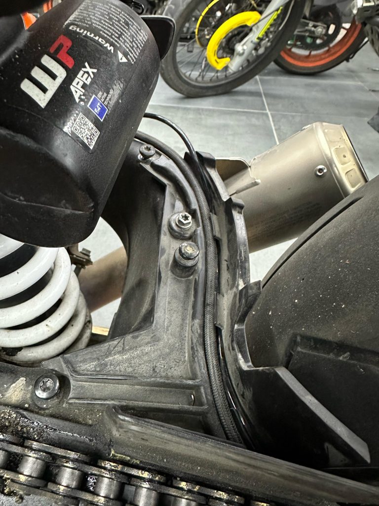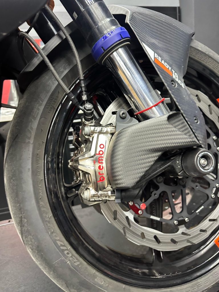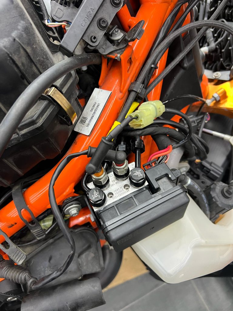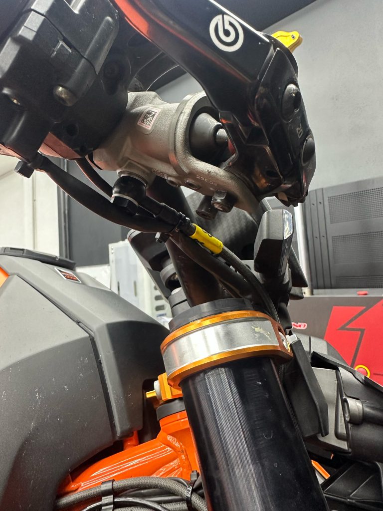NOTA: i passaggi dei tubi anteriori differiscono dagli originali. Il kit è stato realizzato eliminando il ripartitore a 3 vie sotto al canotto di sterzo: un tubo va dalla centralina ABS alla pinza ed un altro passa sopra il parafango.
